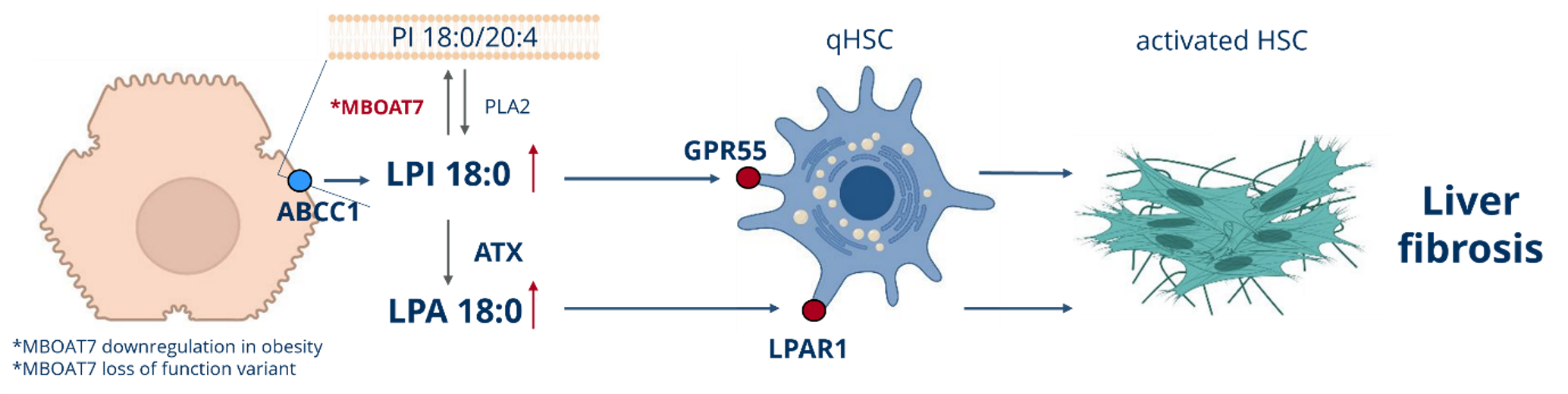 Hepatic-MBOAT7 downregulation in obese humans and mice is associated with the development of liver fibrosis. We hypothesise that bioactive lipids secreted by MBOAT7-deficient hepatocytes mediate pro-fibrotic crosstalk with hepatic stellate cells (HSCs) via specific lipid signalling pathways. Using in vitro experiments with mouse/human primary cells and mass spectrometry based lipidomics we will identify molecular players of the proposed signalling mechanism and validate it in vivo using various transgenic mouse models and pharmacological inhibitors. Our findings will identify druggable pathways that drive the MBOAT7-dependent cellular crosstalk and fibrosis.